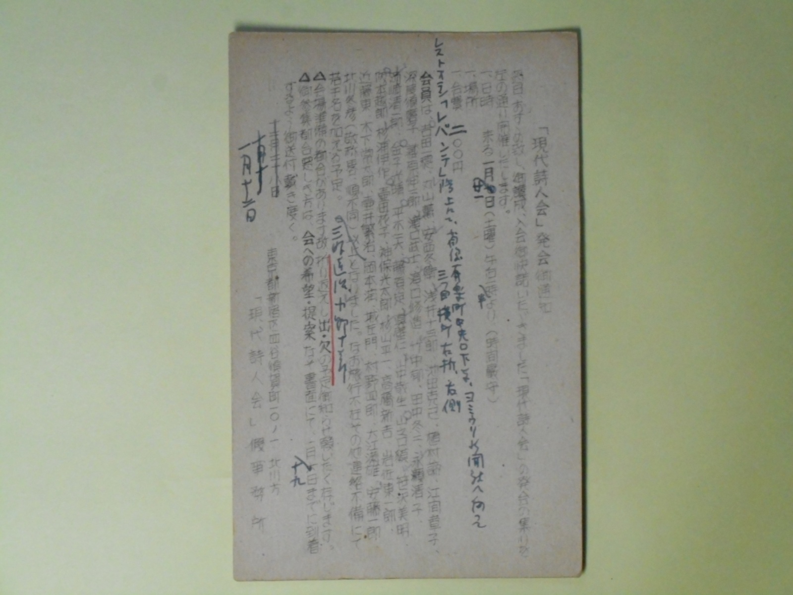1950。「現代詩人会」仮事務所。「現代詩人会」発会御通知(葉書)(平木二六宛)。昭和25年1月12日消印(消印判読困難箇所あり。1月12日記)。「現代詩人会」が発会したときの通知はがき。発会の集まりの案内、会員名列記。印刷したものにペンにて加筆訂正。