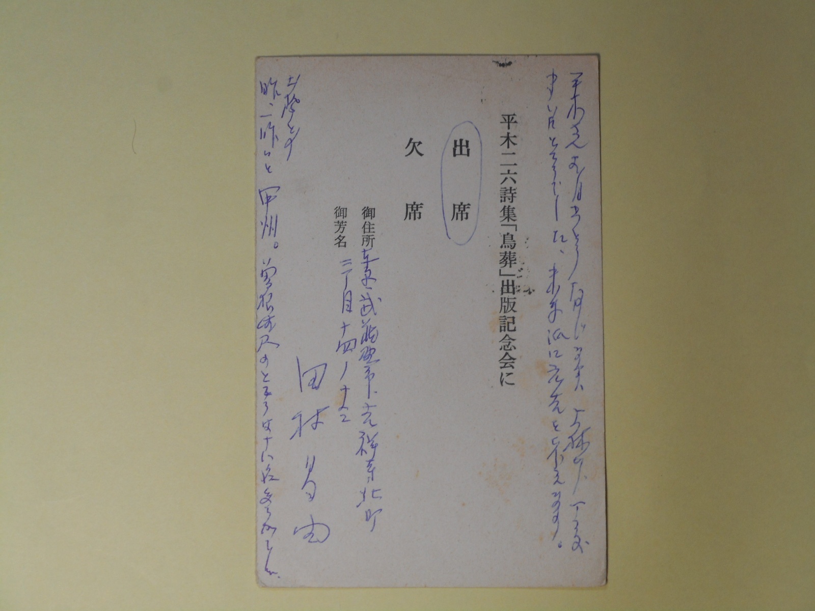 ホーム | 文学 > 日本文学(詩)田村昌由葉書(土橋治重方・平木二六詩集『鳥葬』出版記念会準備係宛) 田村昌由
